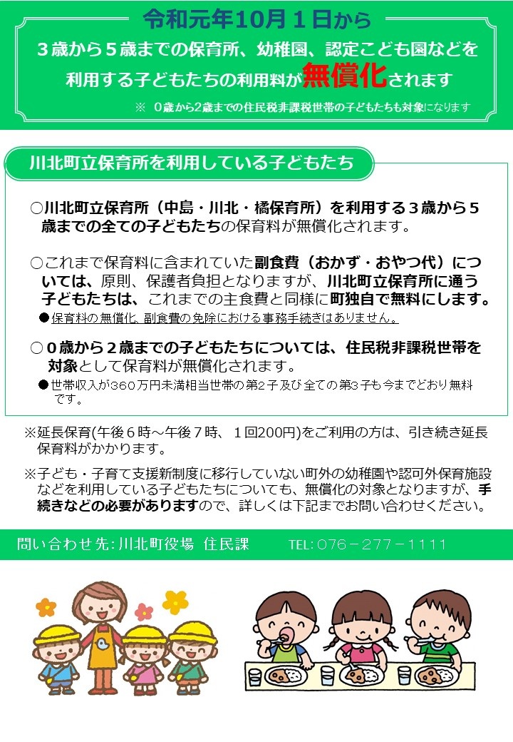 令和元年度から、3歳~5歳までの保育所、幼稚園、認定こども園などを利用する子どもたちの利用料が無償化されます。※0歳から2歳までの住民税非課税世帯の子どもたちも対象になります。 詳しくは、下記ポスターをご覧いただくか、役場住民課までご連絡ください。