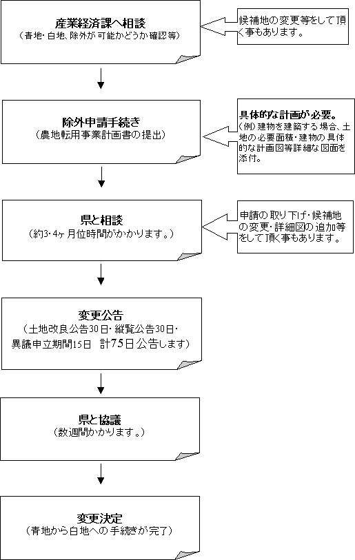 川北町全域は、原則、農地を保全していく地域と定められています。農地を転用する場合、いわゆる青地農地では、農業以外のことは行えませんので、農用地から除外する手続き(白地農地にする)が必要です。除外の手続きは1年程度の期間が必要となります。また、除外できない場所もあります。詳しくは、産業経済課にお問い合わせください。手続きは随時受付けています。