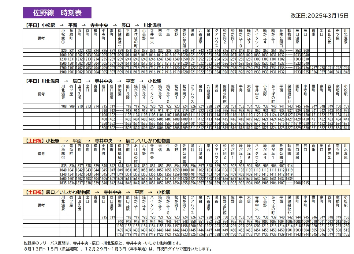 小松方面への通勤・通学の利便性向上のため、辰口~小松駅間を運行している北鉄白山バス(佐野線)の一部ダイヤが3月15日より、川北温泉まで延伸されますのでどうぞご利用ください。