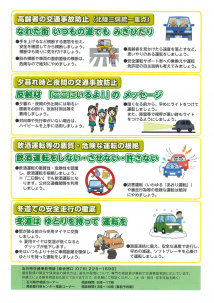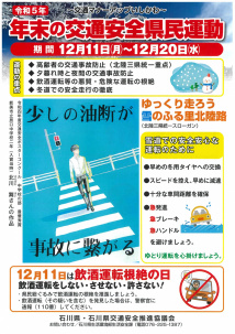 令和5年12月11日(月曜日)~12月20日(水曜日)は「年末の交通安全県民運動」の実施期間です。 【運動の重点】 ・高齢者の交通事故防止 ・夕暮れ時と夜間の交通事故防止 ・飲酒運転等の悪質・危険な運転の根絶 ・冬道での安全走行の徹底 交通事故は、ほんの少しの不注意で、尊い命が失われてしまいます。 交通ルール・交通マナーをしっかり守り、悲惨な交通事故を地域総ぐるみでなくしましょう。
